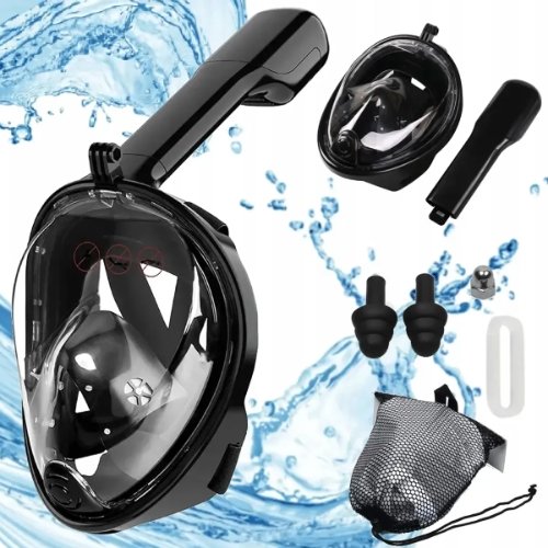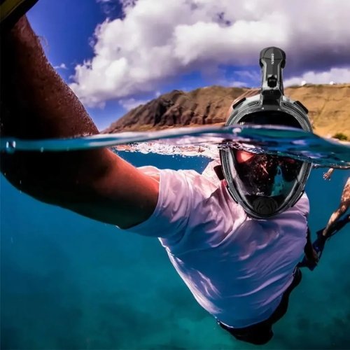 Nowoczesna maska pełnotwarzowa do snorkelingu z rurką, składana, wyposażona w system AntiFog oraz DryTop. Zapewnia szerokie pole widzenia 180° i maksymalny komfort podczas pływania oraz nurkowania.