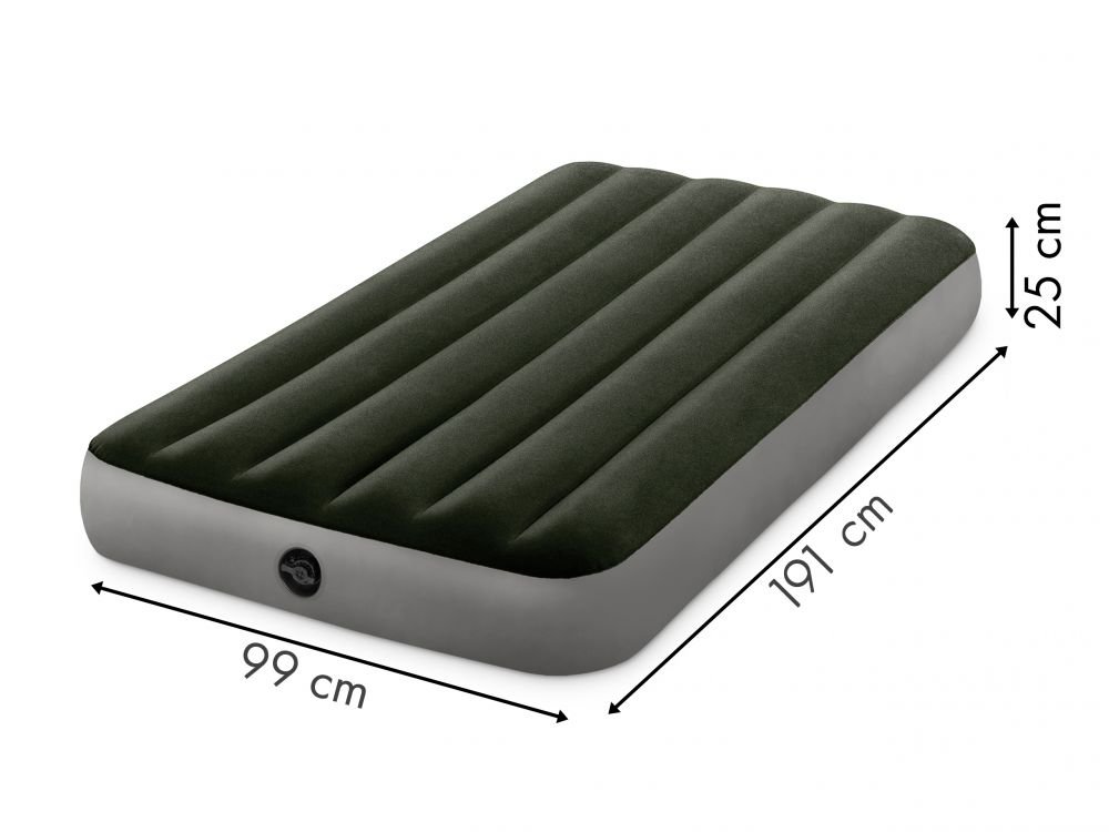 Materac welurowy INTEX o wymiarach 191x99x25 cm jest idealny dla wypoczynku 1 osoby. Wykonany z mocnego tworzywa PVC, na górze został pokryty przyjemnym w dotyku wodoszczelnym materiałem welurowym. Całość w przyjemnej, zielonej kolorystyce będzie pasowała do każdego wnętrza. Maksymalne obciążenie materaca to 136 kg.