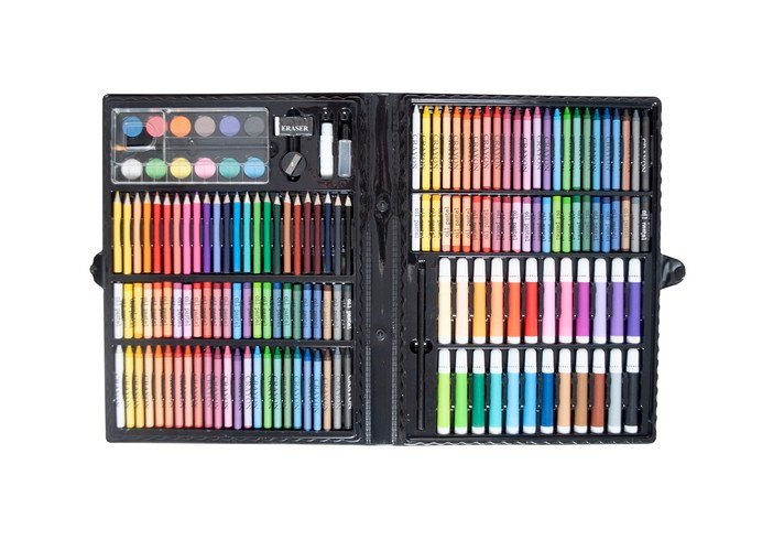 168 ELEMENTÓW – przy pomocy ogromnego wyboru 24 kredek, 24 mazaków, 48 pasteli olejowych, 48 pasteli świecowych, 12 farb akwarelowych, temperówki, kleju, korektora, ołówka, gumki do mazania, kartek a4 z łatwością stworzymy najbardziej wymyślne, kreatywne i oryginalne prace.