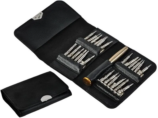 Naprawa nowoczesnych urządzeń elektronicznych wymaga nie tylko umiejętności, ale również wykorzystania odpowiedniego, precyzyjnego sprzętu. Producenci stosują różnego rodzaju zabezpieczenia, co sprawia, że do ich otwarcia wymagane są dodatkowe końcówki, które trudno znaleźć w podstawowych zestawach wkrętaków. Zestaw specjalistycznych wkrętaków to 25 elementów znajdujących się w etui zamykanym na magnes. Każdy element posiada swoje własne miejsce, co pozwala na zachowanie porządku oraz sprawną organizację miejsca pracy, a tym samym jej szybkie i dokładne wykonanie. Komplet przeznaczony jest zarówno do napraw telefonów, smartfonów i tabletów jak również wszystkich innych urządzeń i sprzętów, które posiadają niestandardowe, drobne śruby.